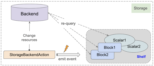 In the FlutterArtist design, a StorageBackendAction is essentially an event occurring within the Storage but outside the Shelf(s). Therefore, it is categorized as an External Shelf Event — similar to an event happening on a different Shelf from the current one.
