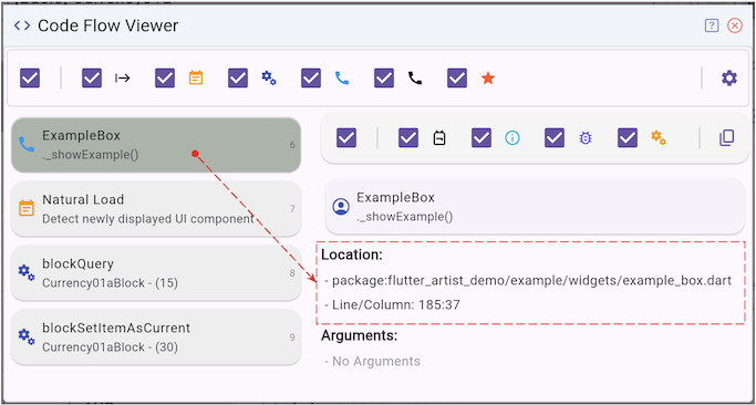 Several core and critical methods of FlutterArtist are pre-integrated with the FlutterArtist.codeFlowLogger.addMethodCall() call at their very first line. This generates ExecutionTrace(LibMethodCall), which you can observe directly on the Debug Code Flow Viewer.